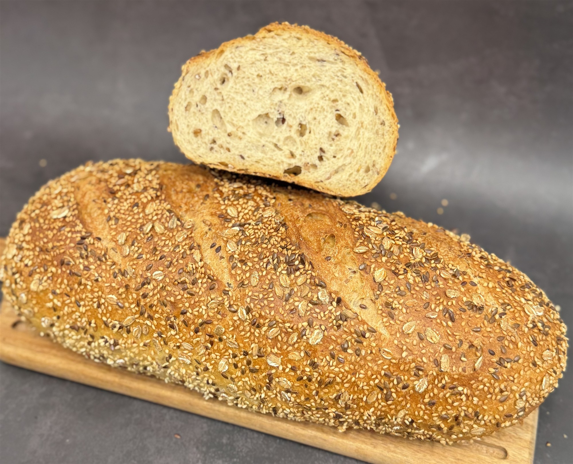 Bagt med hvedesurdej, hvedemel, fuldkornshvede og forskellige kerner