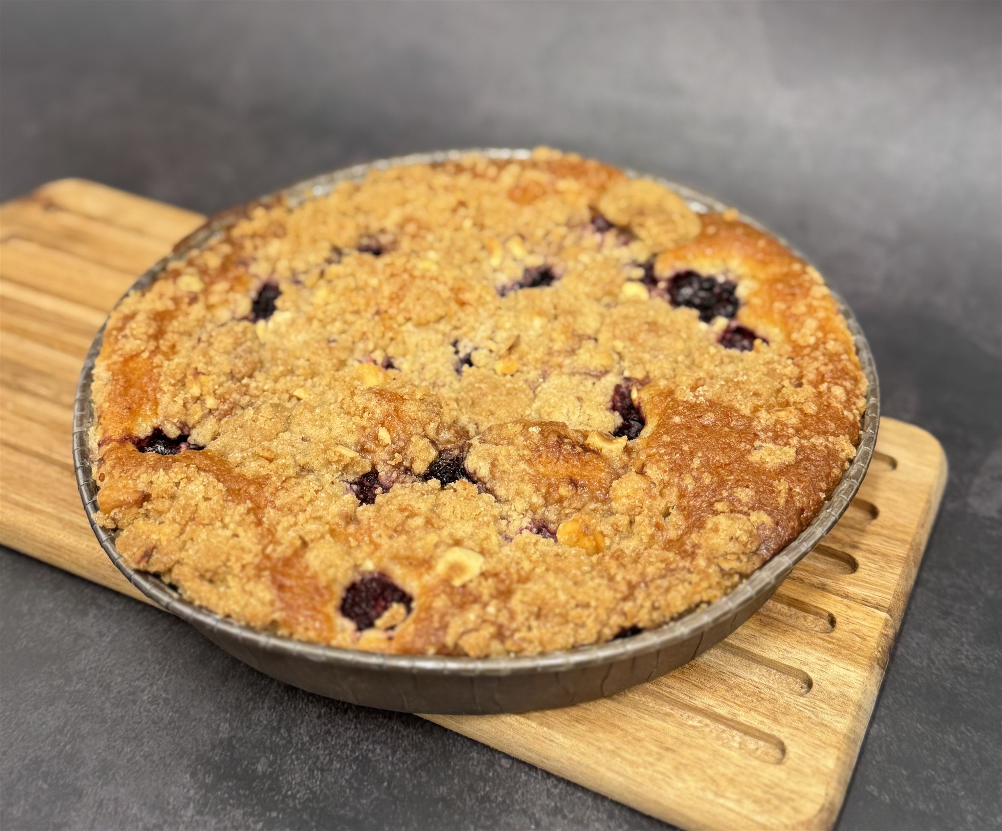 Lys skærekage med brombær og streusel på toppen