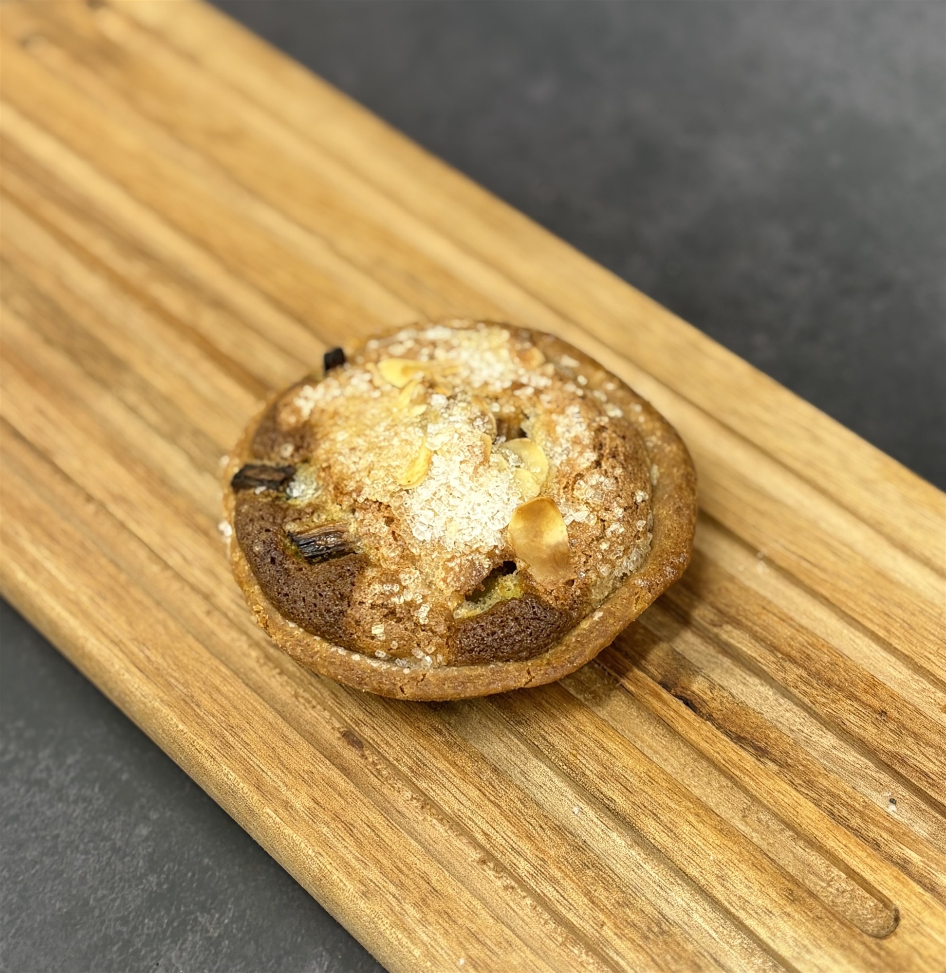 Linsedejsbund med mazarinmasse, rabarbær, vaniljesukker og makronmasse på toppen