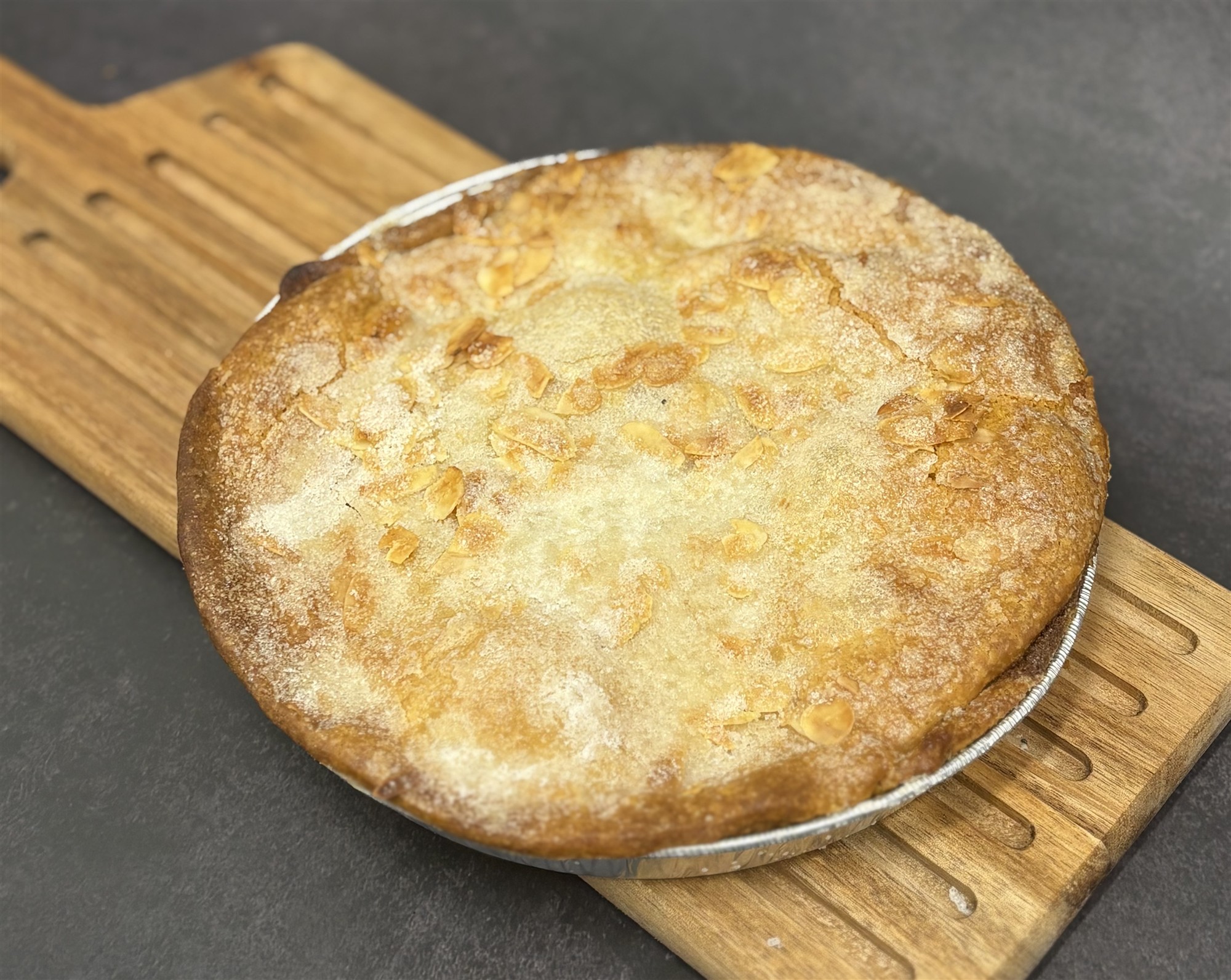 Linsedejsbund med mazarinmasse, halve pære og linsedejslåg drysset med sukker og mandelflager