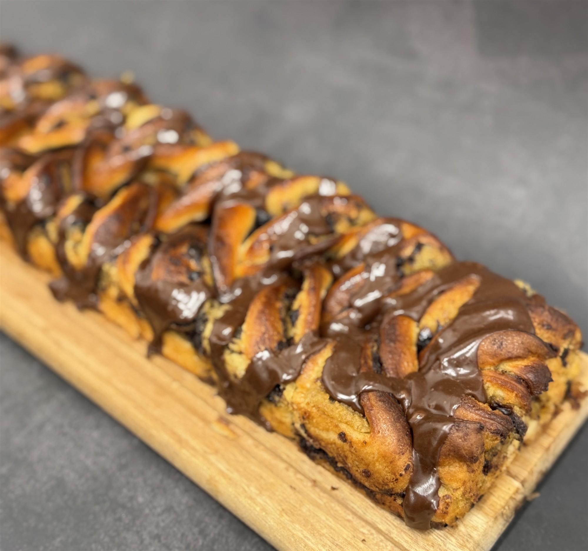 Bløddejsstang med kakaoremonce, chokoladestykker og pyntet med brun glasur